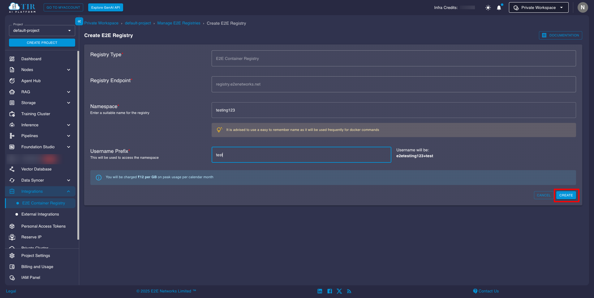 - Click on the "E2E Container Registry” sub-menu available under the Integrations section.
