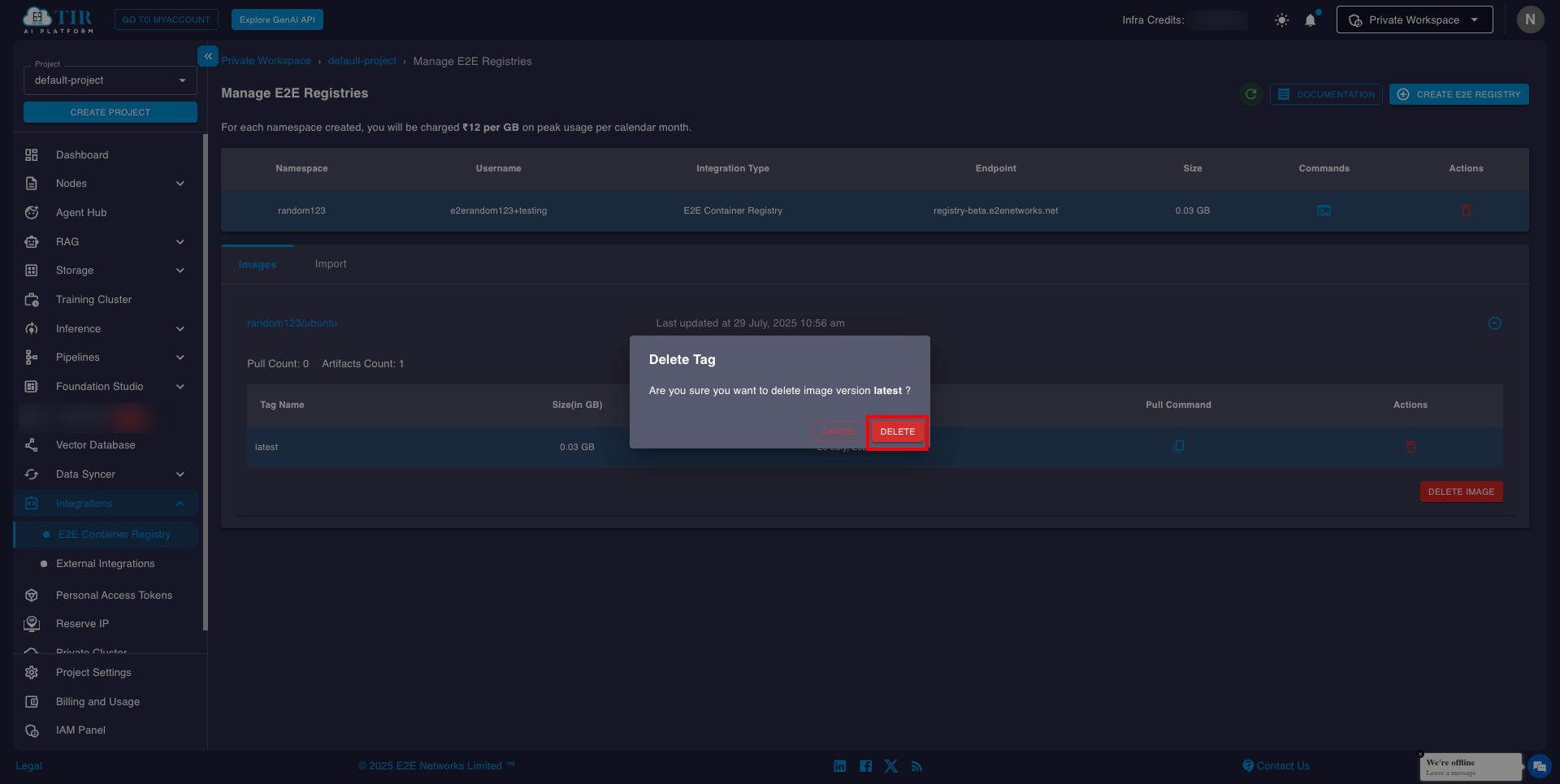 To delete a container registry, click on the Delete icon next to the respective container registry. A confirmation popup will be open, confirm it and click on Delete.